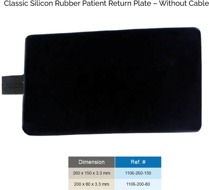 High-quality reusable silicone rubber patient return plate for safe and efficient monopolar electrosurgery. Offers optimal conductivity, flexibility, and long service life. OEM and private labeling available.
