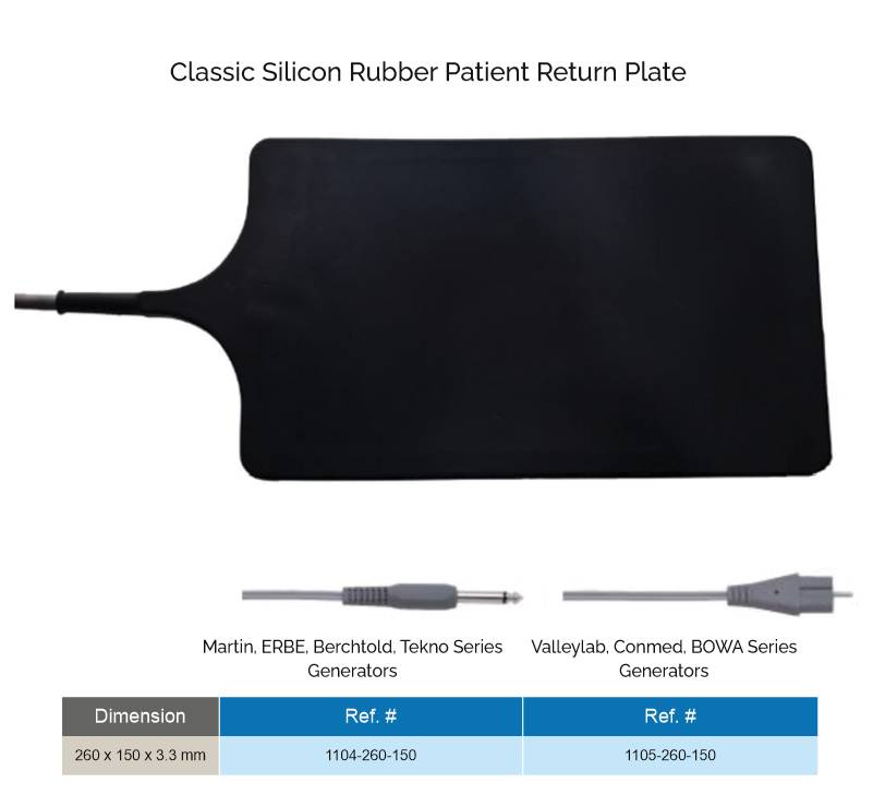 High-quality reusable silicone rubber patient return plate for safe and efficient monopolar electrosurgery. Compatible with leading generators including Martin, ERBE, Berchtold, Tekno, Valleylab, Conmed, and BOWA. Offers optimal conductivity, flexibility, and long service life. OEM and private labeling available.