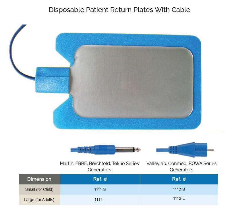 Single-use patient return plate with pre-attached cable for quick, sterile, and secure grounding in monopolar electrosurgery. Ensures optimal conductivity and patient safety. Compatible with major ESUs including Valleylab, ERBE, Conmed, BOWA, Martin, and Berchtold. Available in adult and pediatric sizes. OEM and private labeling available.