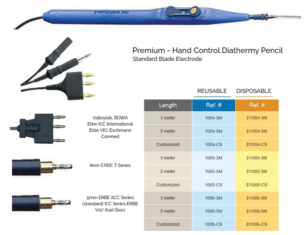Premium quality, Less cost, patient safety & autoclave property, hand control diathermy pencil with standard blade electrode for precise cutting and coagulation. Features push-button activation, 3-pin or 2-pin connector options, and compatibility with most electrosurgical units.