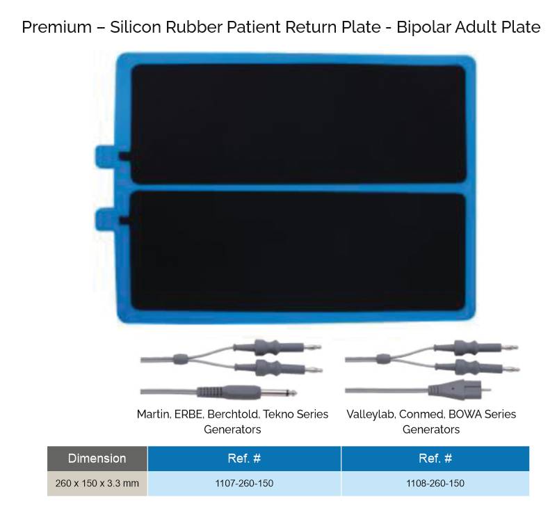 EPISURG presents the premium silicon rubber reusable bipolar patient return plate for safe and efficient electrosurgery procedure. Compatible with leading generators including Martin, ERBE, Berchtold, Tekno, Valleylab, Conmed, and BOWA. Offers optimal conductivity, flexibility, and long service life. OEM and private labeling available.