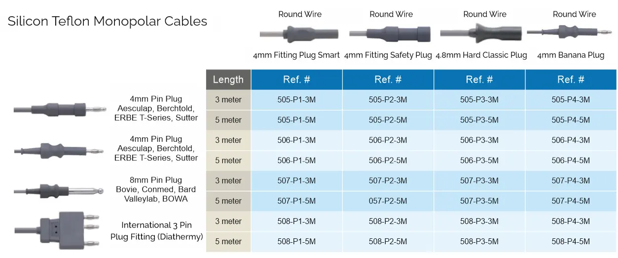 High-performance silicon Teflon-insulated monopolar cables, available in OEM configurations including split wire, round wire, flat plug, classic banana plug, pin and safety pin fittings. Designed for reliability and compatibility with major electrosurgical generators. Custom lengths and private labeling available.