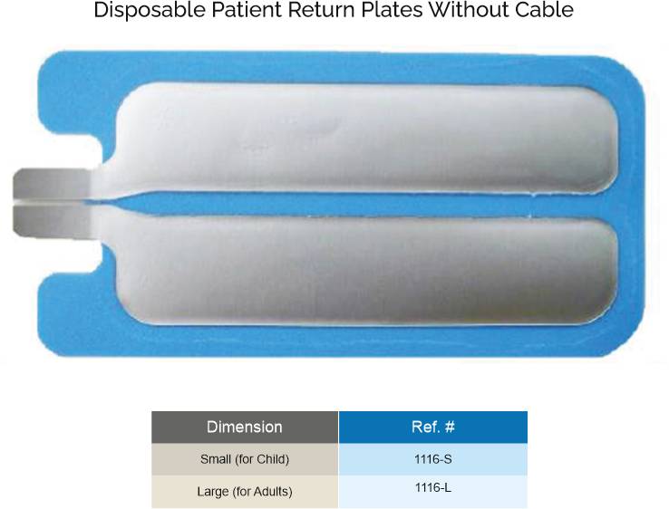 Single-use patient return plate without cable for quick, sterile, and secure grounding in electrosurgery procedure. Ensures optimal conductivity and patient safety. Available in adult and pediatric sizes. OEM and private labeling available.